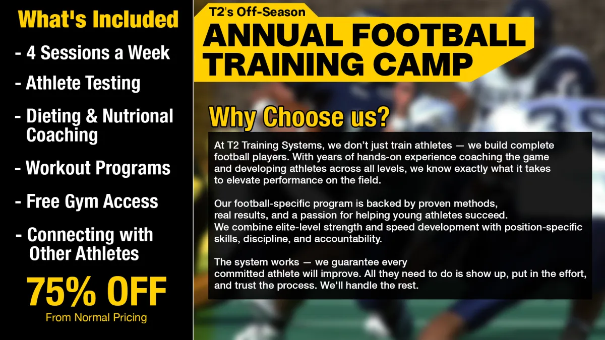 At T2 Training Systems, we build strong, explosive, confident athletes ready to dominate when the season arrives. Our program goes beyond strength and speed — we focus on athletic development, eliminating weaknesses, reducing injury risk, and instilling the confidence and discipline it takes to excel both on and off the field.